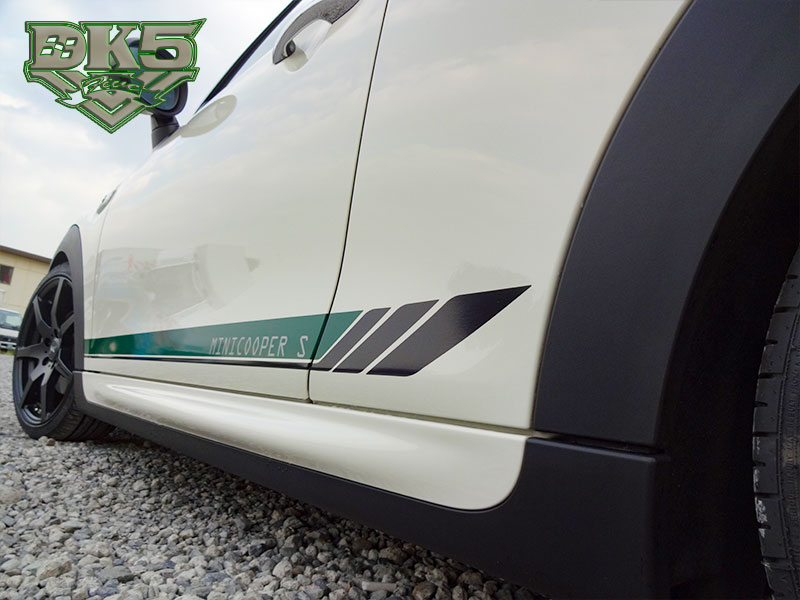 BMW MINIサイドストライプ, 制作例のご紹介 BMW MINI F56 COOPER S に、グリーンサイドライン 2017年8月31日 / 埼玉県富士見市のDK5です。 BMW MINI F56 COOPER S に、グリーンを使ったサイドラインです。 以前ルーフラッピングを施工しましたこちらのMINI。 今回はサイドラインです。 ボンネットストライプのグリーンと同じカラーを使用。 先端は細くなるようデザインしました。 施工後