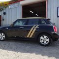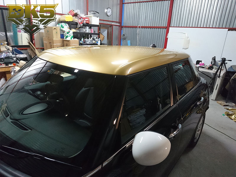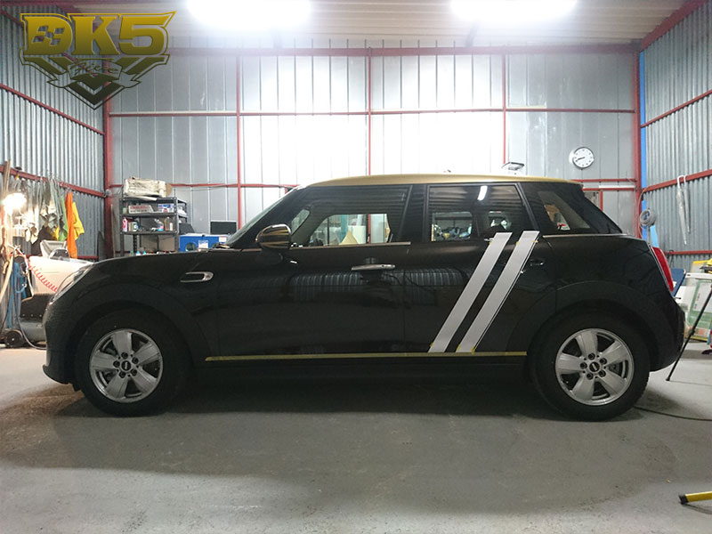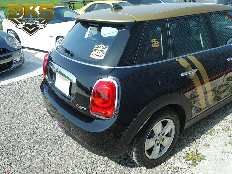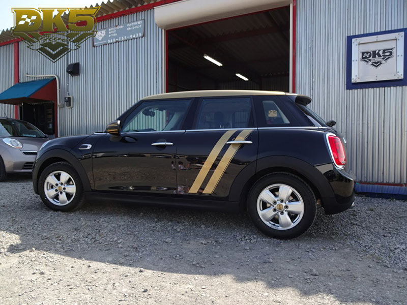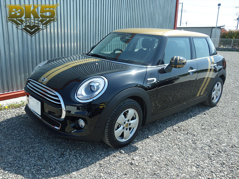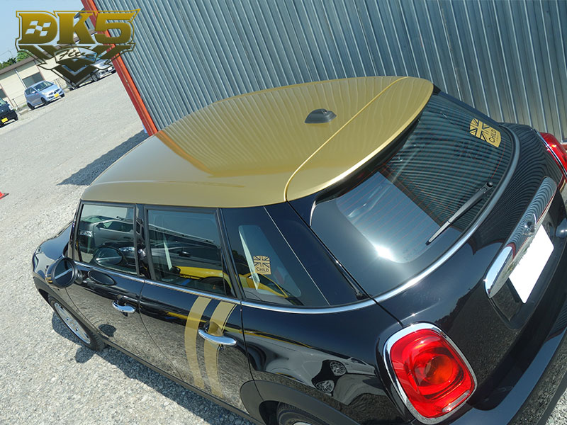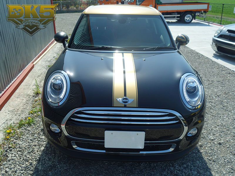 BMW MINI F55 5DOOR ゴールドルーフラッピングと、センターストライプ、サイドにライン施工。