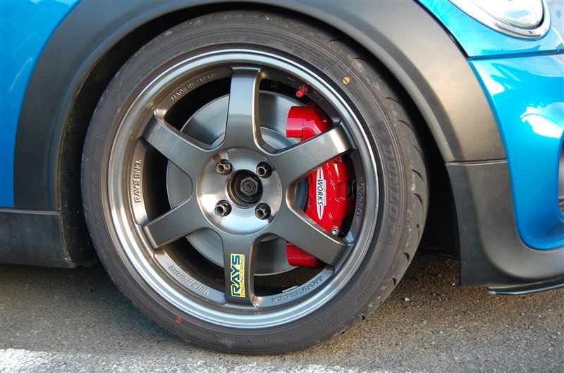 このMINIのオーナーさんはサーキットを本気で走る方で、ブレーキパットはサーキット用が入っています。