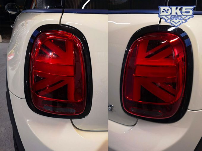 テールランプは艶ありブラック。そのままだとつまんないので、ユニオンジャックの延長したとこにブルーでアクセントを入れてみました。全部入れるとうるさいので上だけです。
