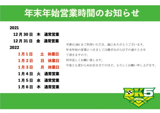 年末年始の営業のお知らせ